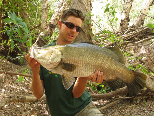 Another game little Barra from a clear pool under the paper bark trees. The thick, rich but subtle smell of the paper bark flowers drifted down the river everyday and intensified as the day cooled towards the evening. I began to understand why come night time the bats were excited. The sweet smell must have been driving them wild all day. Come night time they were desperate for the honey.